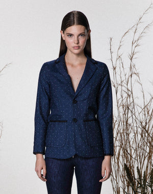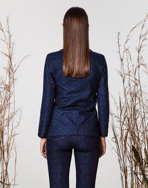 Blazer jeans com poa branco clássico, gola estilo alfaiataria, mangas longas e bolsos frontais. Aplicação nos punhos e bolsos.