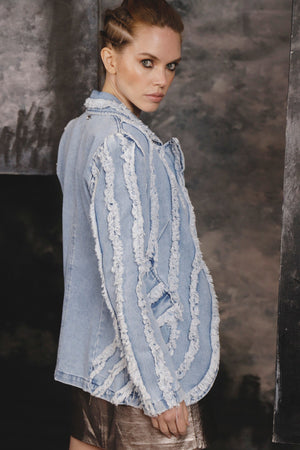 Um blazer jeans desfiado que reflete um estilo despojado e ao mesmo tempo acinturado, perfeito para mulheres elegantes que buscam uma peça única e exclusiva. Sua versatilidade permite criar looks sofisticados e modernos. Adicione um toque de ousadia ao seu guarda-roupa com esse blazer jeans de alta qualidade.