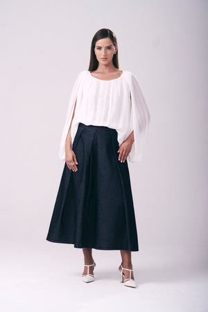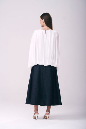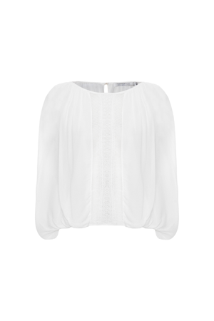 Esta blusa ampla em georgette de viscose combina sofisticação e conforto com suas mangas longas e soltas e decote redondo delicadamente franzido. O patchwork vertical de rendas na parte frontal realça a elegância da peça, enquanto sua modelagem ampla valoriza todos os tipos de corpo com leveza e estilo refinado. Ideal para um visual sofisticado e versátil.