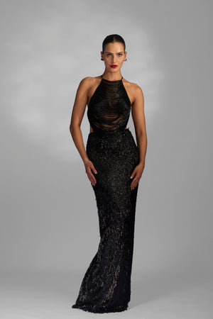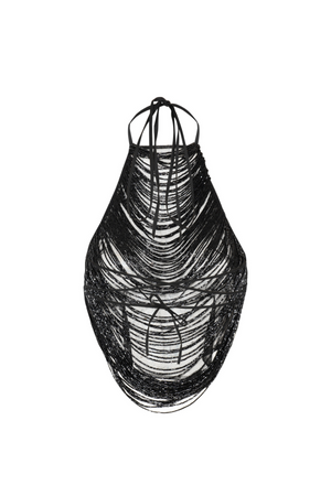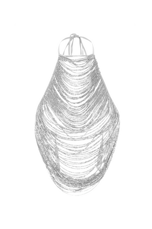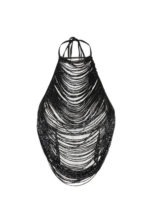 Este top possui um design único, com a frente aberta e costas expostas, proporcionando um visual ousado e elegante. Todo bordado à mão com detalhes de franjas de vidrilho, traz um toque artesanal ao look. Feito com amarrações na parte posterior para ajuste perfeito.