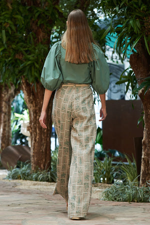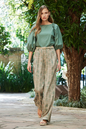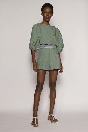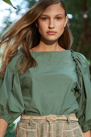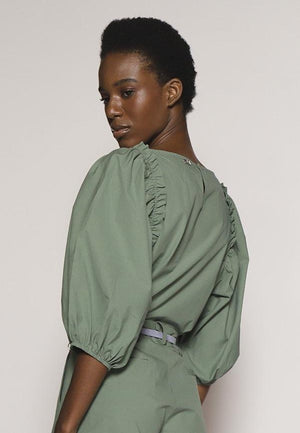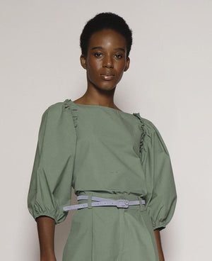 Blusa decote canoa, manga fofa com detalhes em babados na cava, punho elástico e zíper lateral.