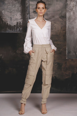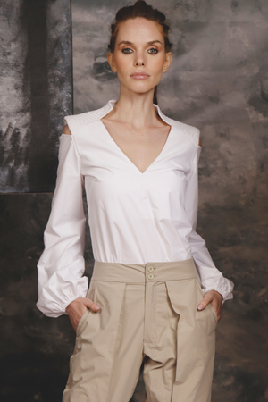 Uma blusa de algodão com toque aveludado, que combina elementos clássicos e contemporâneos, oferecendo uma aparência sofisticada, moderna e feminina. A manga bufante dá volume aos braços, criando um visual dramático, enquanto as ombreiras destacam a estrutura do ombro. A abertura no ombro adiciona um toque sensual e divertido, tornando esta camisa uma escolha perfeita para o dia a dia ou para noite.