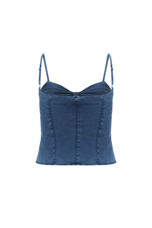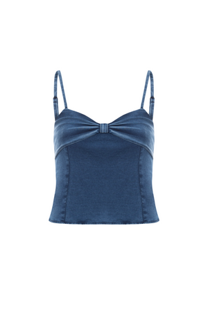 Esta blusa em malha denim apresenta um design sofisticado com alças finas e modelagem ajustada que valoriza a silhueta. O detalhe delicado do laço central no busto adiciona um toque de elegância, enquanto os recortes verticais contribuem para um caimento impecável. Finalizada com barra reta, é a peça ideal para compor looks modernos e femininos com refinamento.
