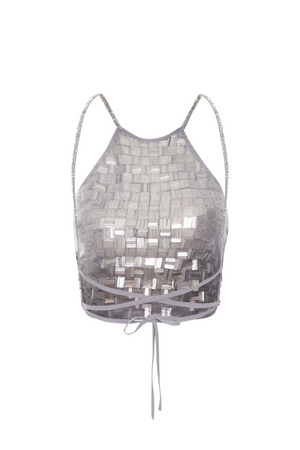 Esta blusa em tule illusion apresenta uma modelagem ajustada que valoriza a silhueta com elegância. As alças finas fixas conferem delicadeza, enquanto o bordado frontal com pedrarias aplicadas em padrão geométrico adiciona um toque sofisticado e exclusivo. O fechamento posterior por amarração nas costas proporciona ajuste personalizado e charme adicional, ideal para ocasiões que pedem um visual refinado e contemporâneo.