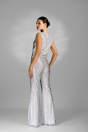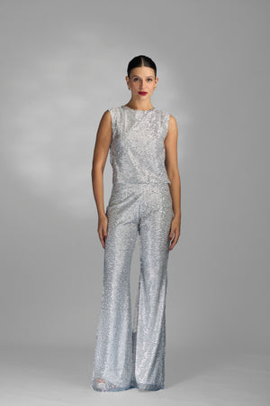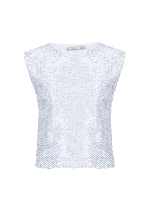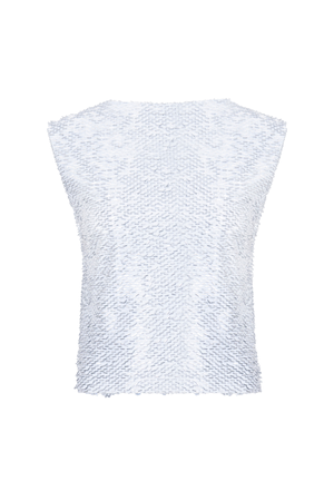 Esta blusa sem mangas, confeccionada em tule delicadamente bordado com canutilhos, combina elegância e modernidade. A gola arredondada realça o design sofisticado, tornando-a perfeita para ocasiões que pedem um toque de charme despojado sem perder a classe. Ideal para quem busca uma peça versátil e refinada.
