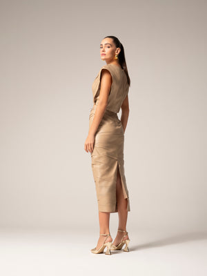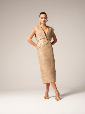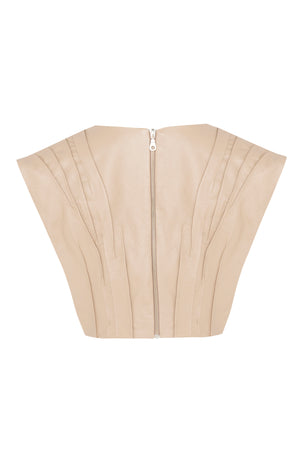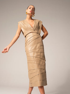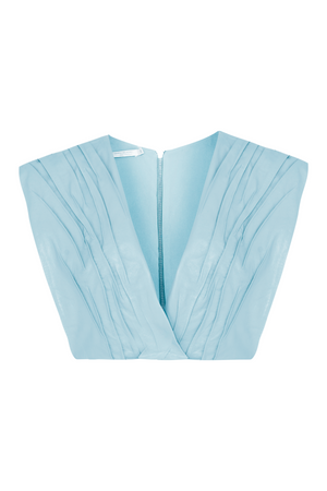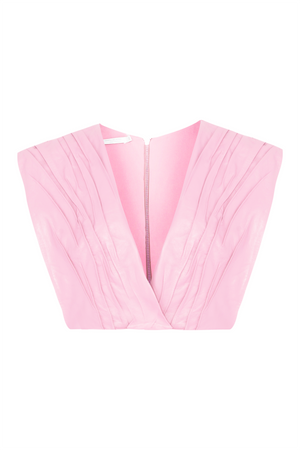 Blusa transpassada de couro pelica, com pregas realizadas com a técnica de moulage, extremamente difíceis de executar e transformam a peça em statement.