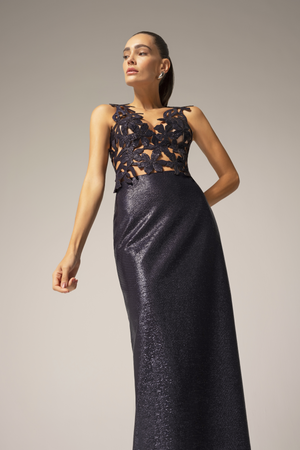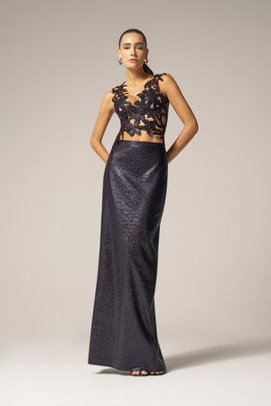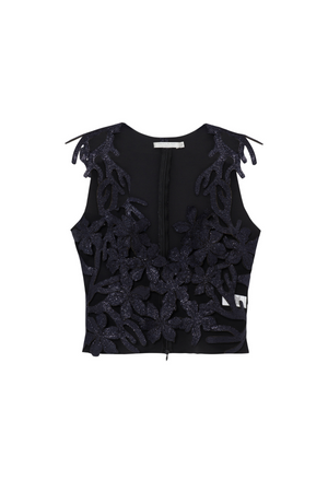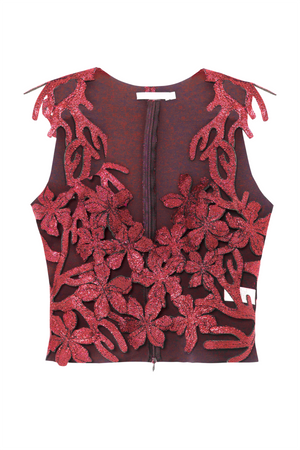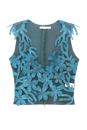 Blusa de lamê, tecido italiano dublado extremamente exclusivo, com recortes vazados de fundo do mar, acompanhado de um bojo na parte frontal e fechamento posterior de zíper.