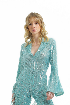 Blusa estilo blazer em micropaetê com lapela bordada.
