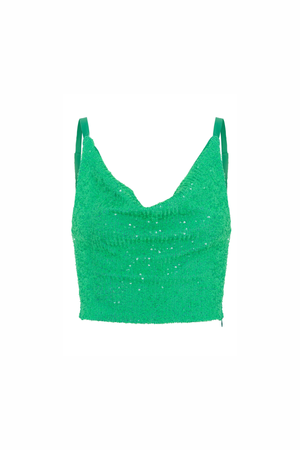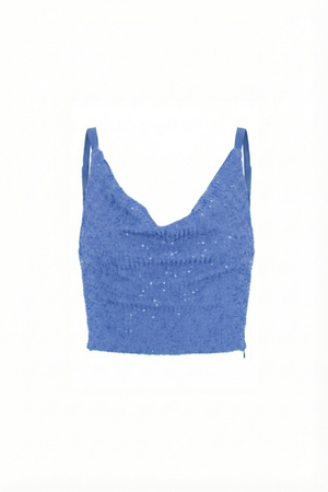Blusa micro paetê de alça com drapeado no decote, perfeita para combinar com a saia do mesmo tecido criando um look de festa fabuloso. E depois você pode usar com outras produções.