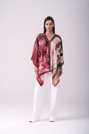 Esta blusa estilo lenço combina seda e viscose em uma modelagem ampla e assimétrica que exala elegância. O decote em V valoriza a silhueta, enquanto a estampa localizada bicolor adiciona um toque sofisticado. Com acabamento em barra contínua, sua versatilidade permite múltiplas formas de uso, ideal para quem busca charme e conforto em uma peça única.