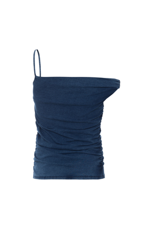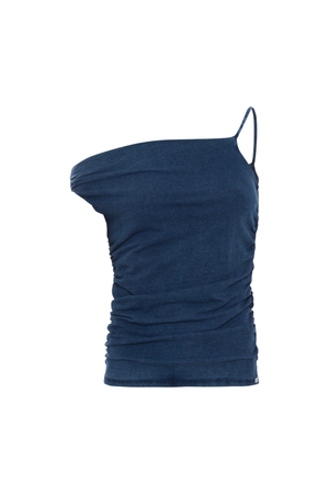 Esta blusa em malha denim apresenta uma modelagem ajustada que realça a silhueta com elegância. Seu design assimétrico destaca um ombro só, combinando uma alça fina com uma alça maior drapeada, que cai suavemente sobre o ombro. O detalhe drapeado que percorre toda a peça confere um toque sofisticado e único, ideal para ocasiões que pedem estilo e distinção.
