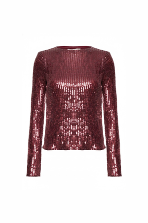 Blusa de manga longa com brilho sofisticado. O modelo possui gola redonda clássica, caimento ajustado ao corpo e acabamento refinado.
