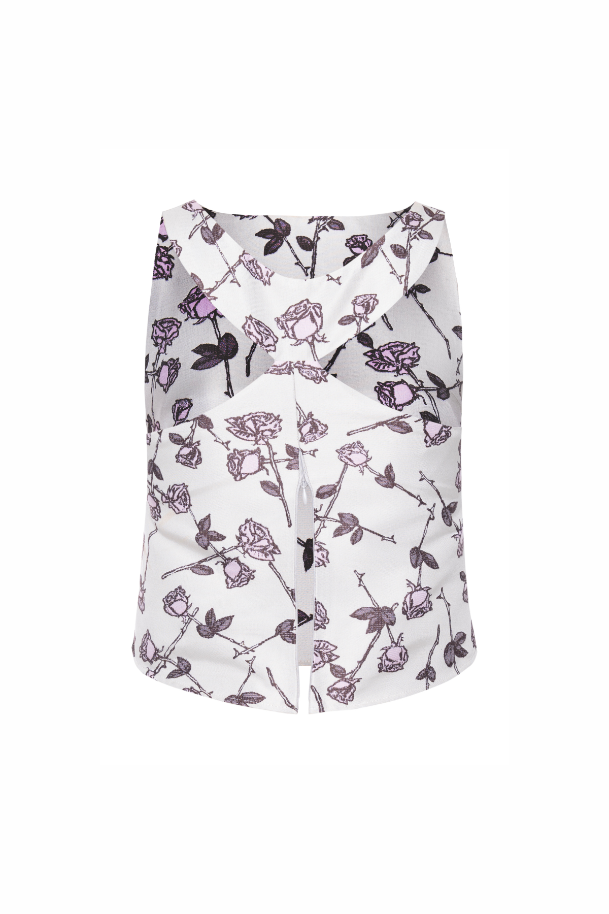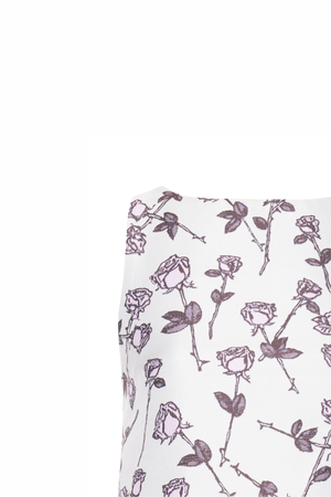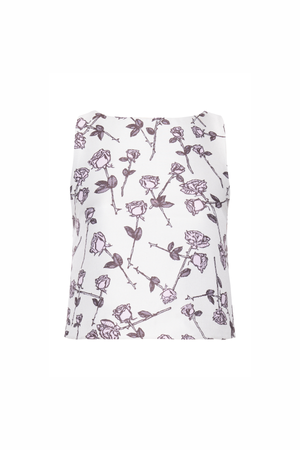 Blusa sem mangas em tecido estampado, com padronagem floral delicada distribuída por toda a peça. O modelo possui decote redondo clássico, caimento reto e acabamento impecável.