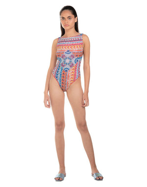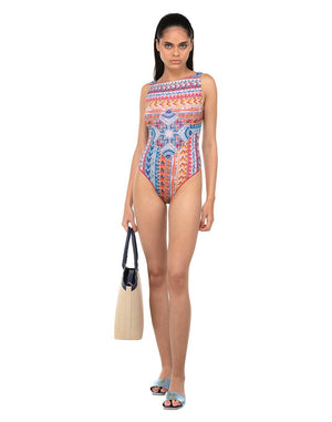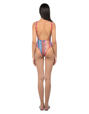 Bordado localizado aleatoriamente na estampa na parte superior do body.