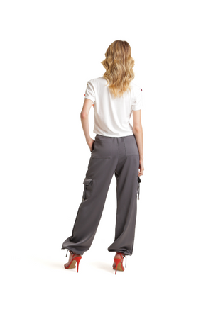 Calça cargo de crepe, com amarrações ajustáveis cós e barra.
