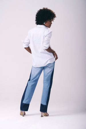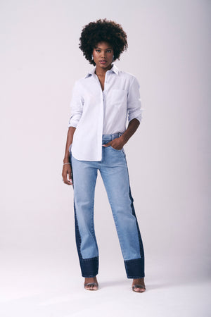 A Calça Jeans Recorte Lateral Bicolor apresenta design sofisticado com recortes bicolores nas laterais e barra, conferindo um toque moderno e elegante. Com modelagem reta, oferece conforto e caimento impecável. O cós com passantes permite uso com cinto, enquanto os bolsos frontais e posteriores garantem praticidade. O fechamento frontal por zíper e botão assegura ajuste seguro e facilidade no vestir. Ideal para composições contemporâneas com estilo refinado.
