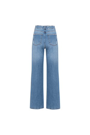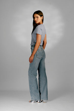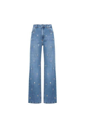 Calça jeans de cós alto, tecido defender de altíssima qualidade garantindo conforto e durabilidade. Seu toque delicado é destacado pela bordado com cristais, adicionando um brilho sutil e versátil para qualquer ocasião.