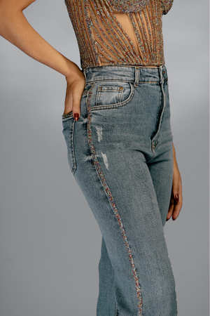 Calça Jeans Cós Alto Bordado Strass