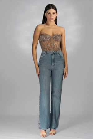 Combine estilo e sofisticação com a Calça Jeans Cós Alto Bordado Strass. Seu cós alto valoriza a silhueta e o bordado com strass adiciona um toque de brilho e sofisticação. Combine com o corselet de strass para um visual ainda mais luxuoso e elegante. Perfeito para mulheres que apreciam peças de alta qualidade e exclusividade.