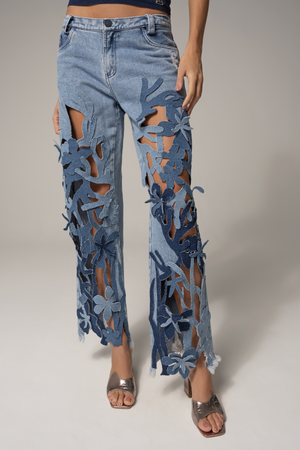 Com a calça jeans cós alto com recortes fundo do mar você não só terá um look moderno como também uma obra de arte inspirada no fundo do mar, com recortes únicos como algas, corais e estrelas-do-mar trazendo sofisticação a peça, ela é um must have para qualquer guarda-roupa. Adquira já!