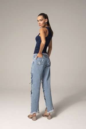 Calça Jeans Cós Alto Com Recortes Fundo Do Mar