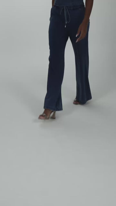 A calça pantalona em malha denim combina conforto e elegância com seu cós elástico e ajuste frontal por amarração. Os bolsos laterais e traseiros com laços aplicados adicionam um toque sofisticado e delicado, ideal para composições refinadas e modernas.