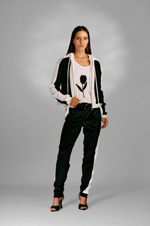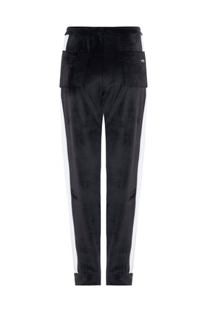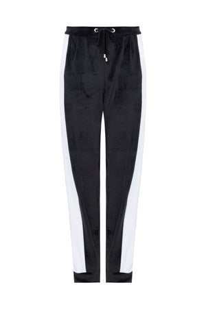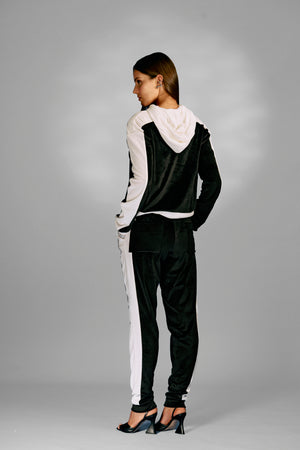 Calça jogger em malha veludo bicolor, o contraste entre preto e branco nas laterais, cria uma linha vertical que alonga a silhueta, cós ajustável por cordão e barras justas nos tornozelos.