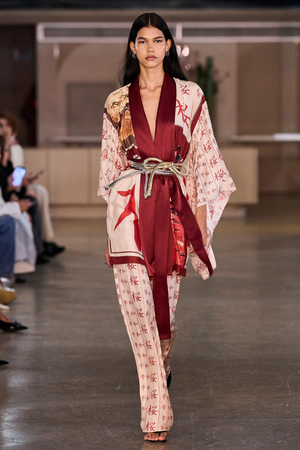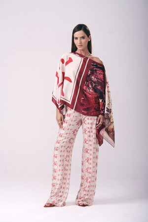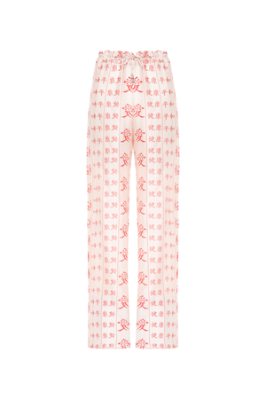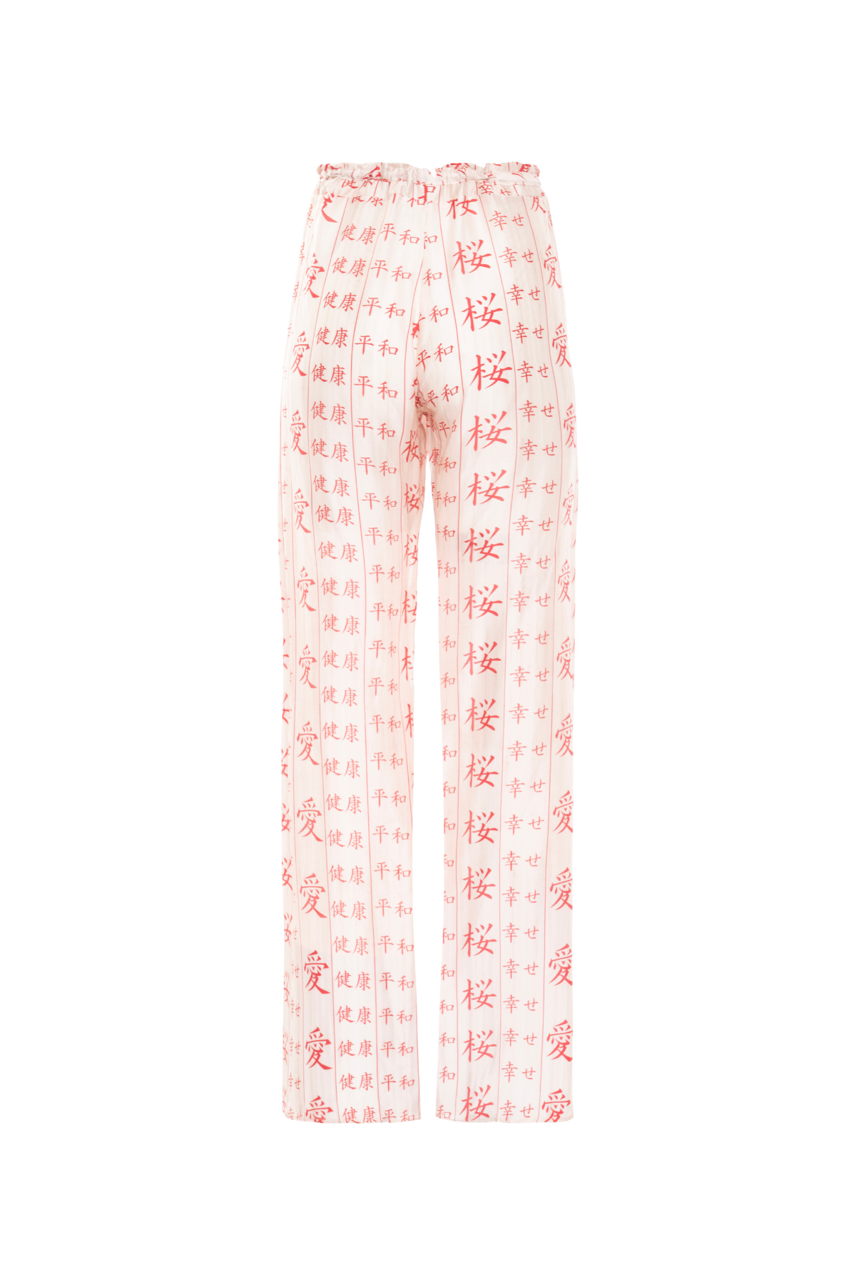 Esta calça estilo pijama, com modelagem reta, combina a leveza da seda com a suavidade da viscose para um caimento fluido e confortável. O cós com elástico embutido garante ajuste perfeito, enquanto a estampa corrida de ideogramas acrescenta um toque artístico e contemporâneo. Ideal para quem busca elegância aliada ao conforto em um design moderno e sofisticado.