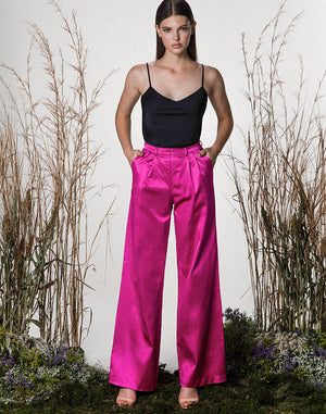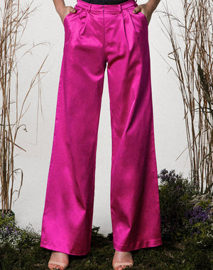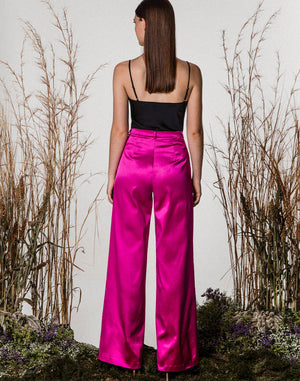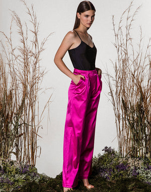 Calça reta com pregas e bolso em cetim, um modelo clássico e sofisticado.