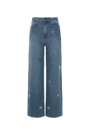 Calça Jeans Wide Leg Com Plaquinhas Ideograma Sakura