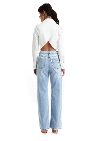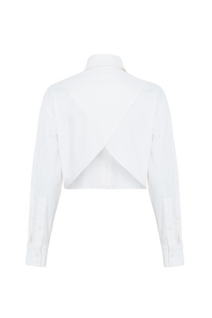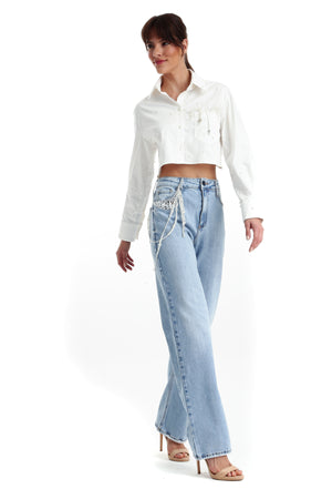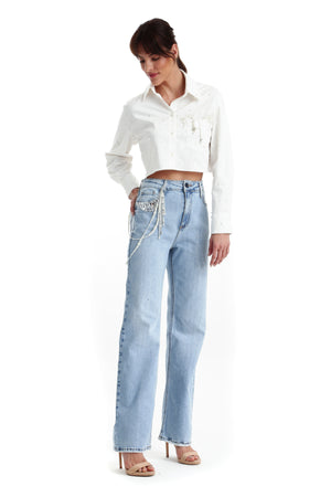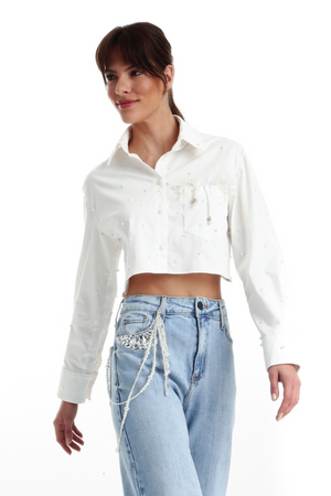 Camisa de tricoline, gola com lapela e manga comprida com acabamento em punho, detalhe bolso frontal, fechamento frontal por botões, recostes transpassado na parte posterior, com bordado de pérolas e detalhes no bolso.