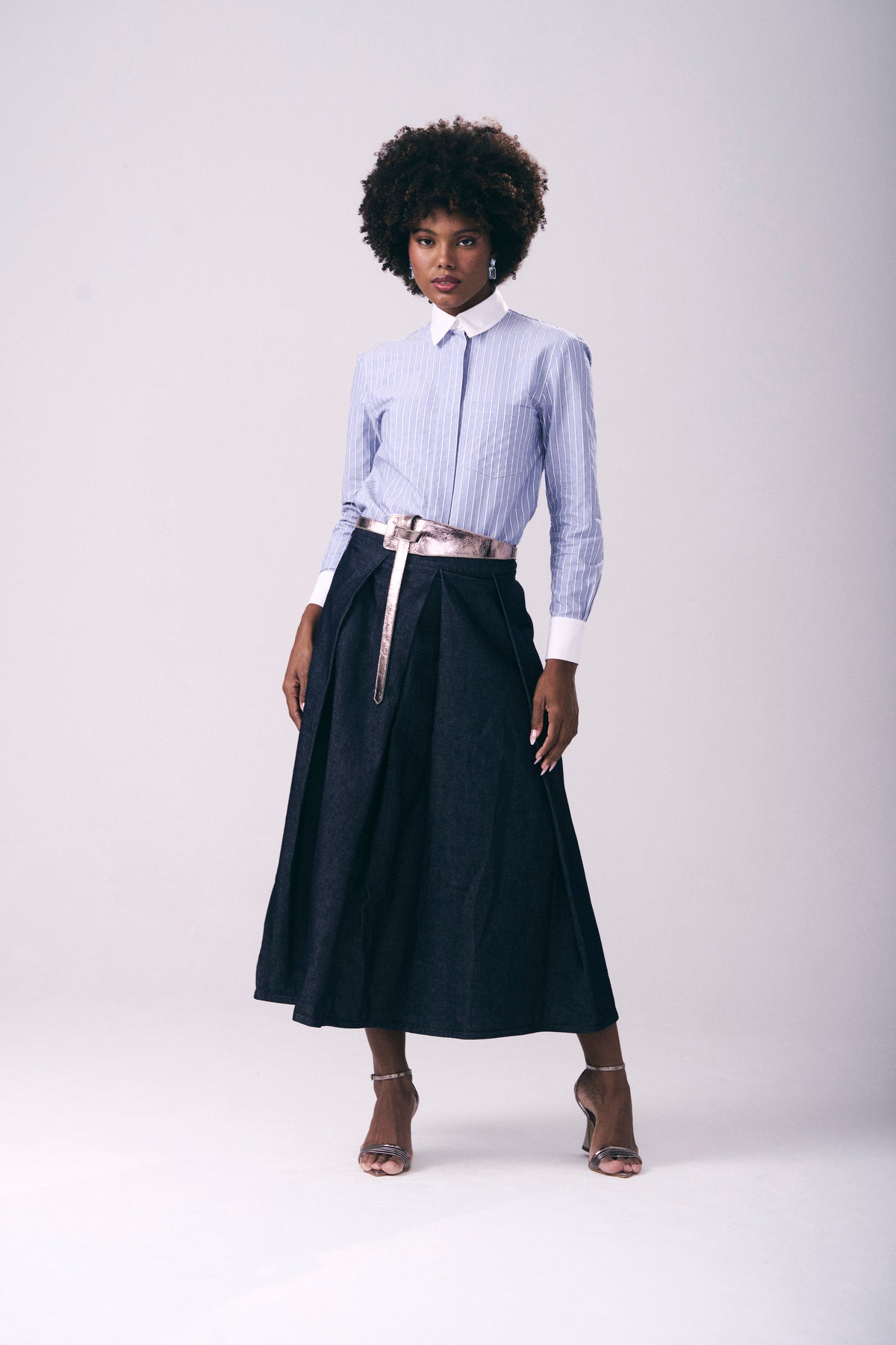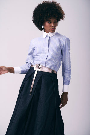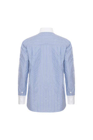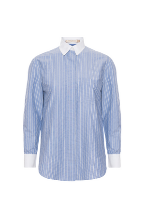 Camisa em tecido listrado de acabamento sofisticado, combinando gola e punhos em tricoline branca para um toque de elegância sutil. Apresenta modelagem reta, mangas longas e fechamento frontal com vista embutida que garantem um visual limpo e estruturado. Com bolso frontal funcional e barra reta, esta peça une o clássico ao contemporâneo, perfeita para composições que exalam estilo e requinte.
