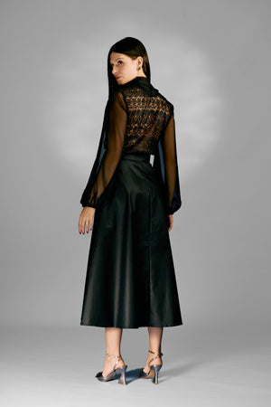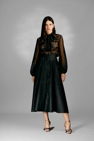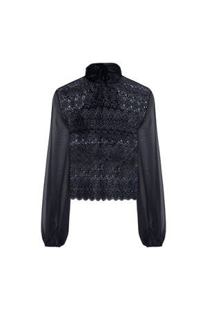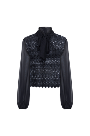 Blusa de renda com delicadas mangas bufantes em musseline, complementada por um laço volumoso e elegante na gola, adicionando um toque romântico e sofisticado.