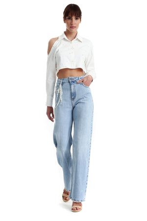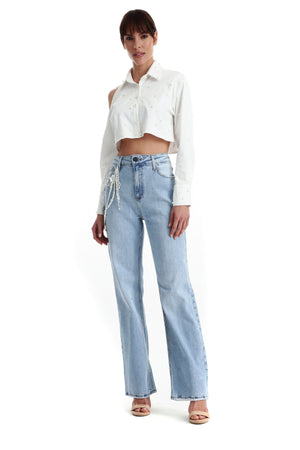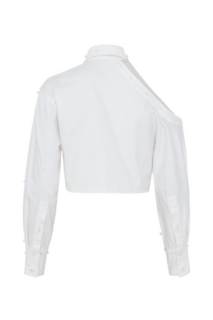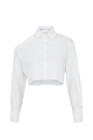 Camisa de tricoline, gola com lapela e manga comprida com acabamento em punho, modelagem descontruída, detalhe vazado no ombro com abotoamentos decorativos e fechamento frontal por botões, bordada com poá de perólas, uma peça despojada que cabe no seu dia a dia.