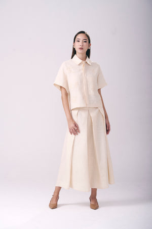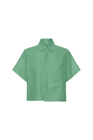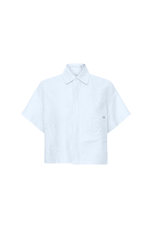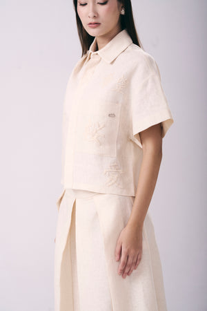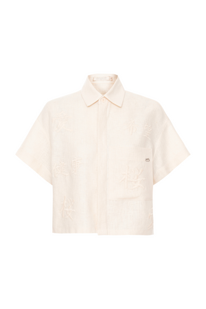 Esta camisa em linho apresenta uma modelagem reta e mangas curtas, combinando conforto e elegância. A gola clássica e o fechamento frontal por botões com vista embutida garantem um acabamento refinado. O bolso aplicado na parte frontal, adornado com bordados de ideogramas, adiciona um toque exclusivo e sofisticado à peça, perfeita para quem busca estilo com personalidade.