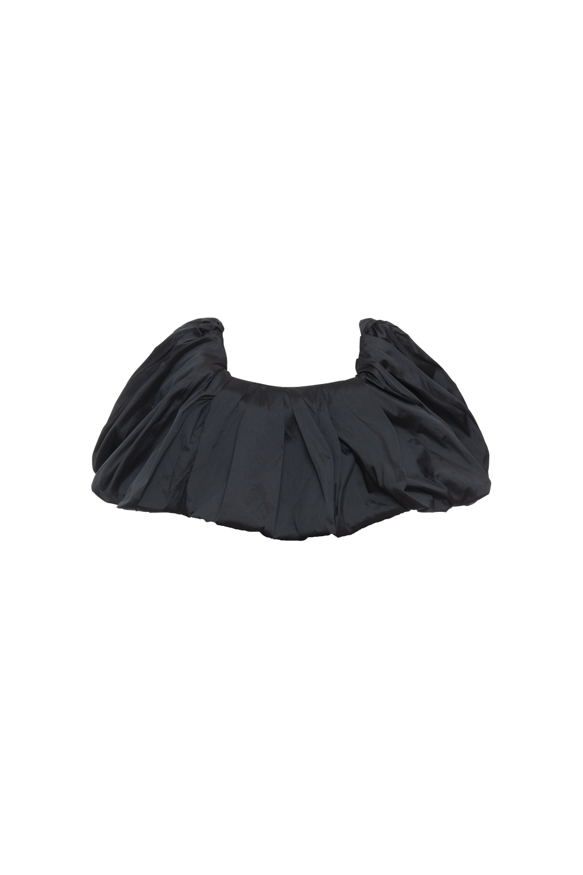 Esta capa curta em tafetá destaca-se pela elegante modelagem balonê, que confere uma estrutura volumosa e sofisticada. Seu comprimento na altura da cintura e o acabamento impecável valorizam o caimento, enquanto a ausência de mangas e fechamento frontal amplia as possibilidades de sobreposição, garantindo um visual contemporâneo e requintado. Ideal para quem busca uma peça única que une estilo e conforto com um toque de modernidade.