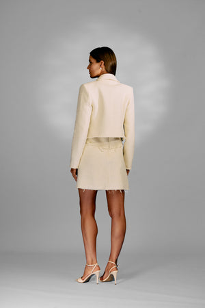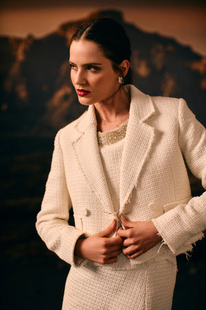 Vista-se com elegância e sofisticação com o Casaco Curto De Tweed. Feito com tecido nobre de tweed, seu corte ajustado e estrutura impecável garantem um visual elegante. Com 4 botões frontais e bolsos embutidos com abas, ele é versátil e perfeito para looks sofisticados.