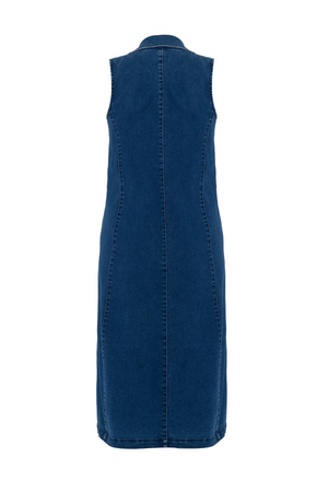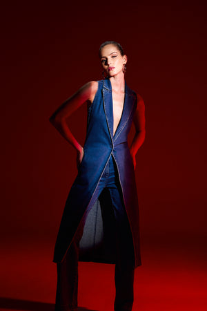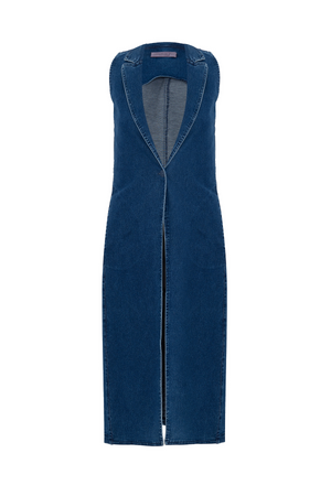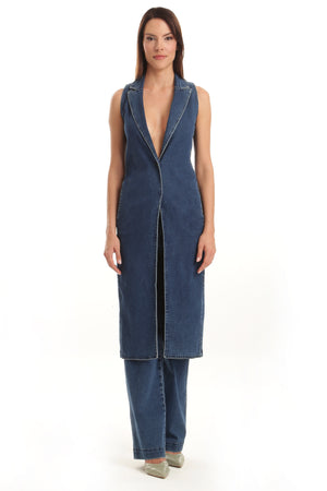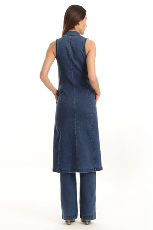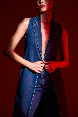 Colete denim, modelagem alfaiataria, possui comprimento longo, o que confere um visual moderno e estiloso. Uma opção elegante para compor looks de inverno e meia-estação e pode ser combinado com diferentes peças de vestuário, desde blusas de manga longa e calças jeans até vestidos e saias.