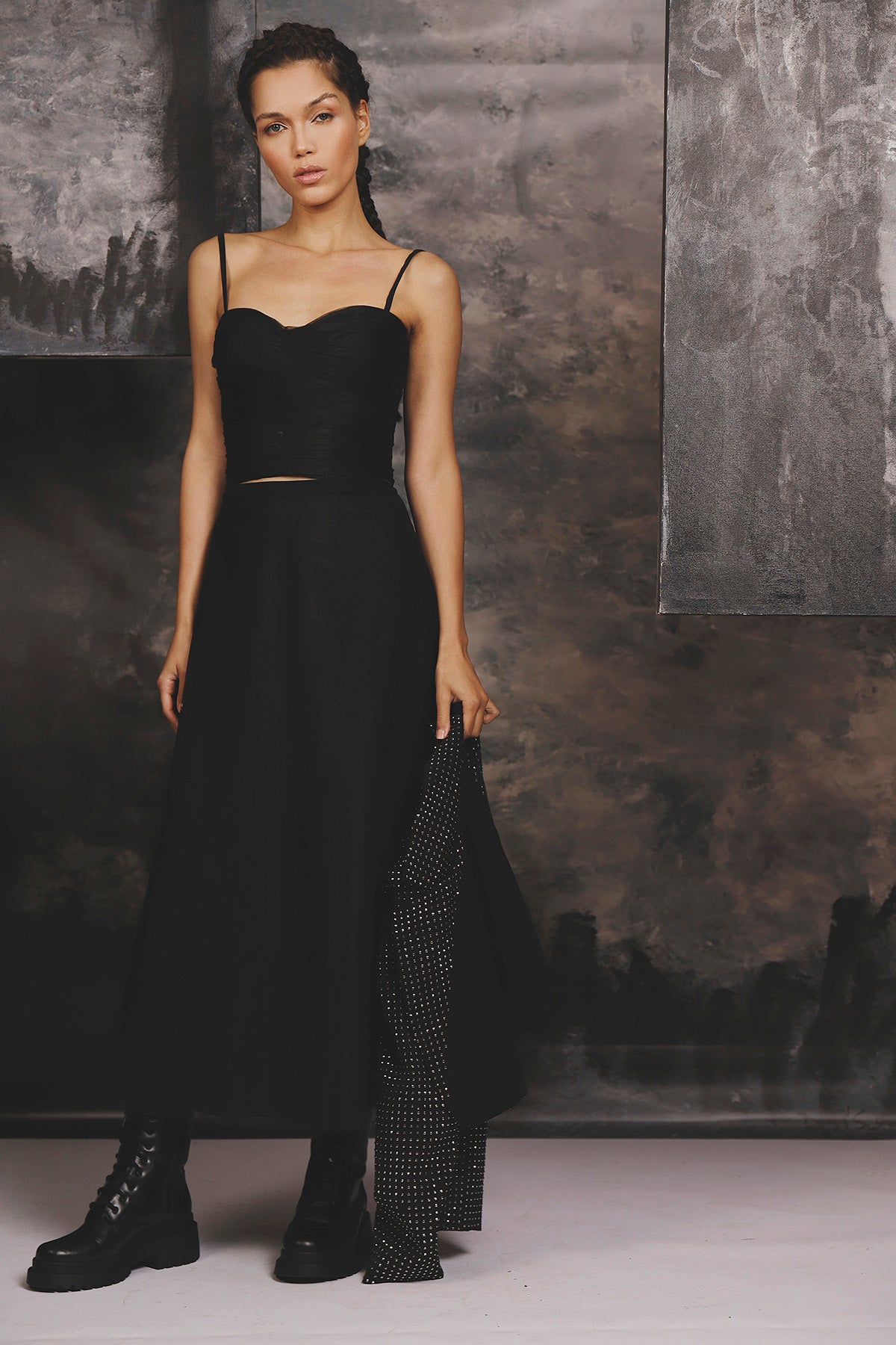 o nosso duo em tule, traz muito charme e romantismo, no design o corselet drapeado e saia midi evasê compõe o look perfeito, para transitar em várias ocasiões, em eventos dia ou noite. Além de um conjunto prático e versátil, te permite fazer várias produções, combine com outras peças, crie o seu próprio estilo.
