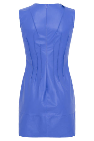 Vestido justo ao corpo, curto, de couro natural, modelagem moulage, com nervuras, fechamento posterior por zíper.