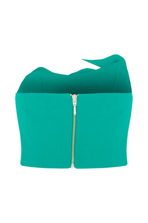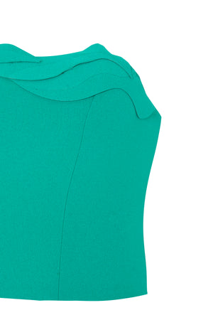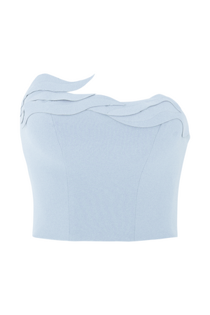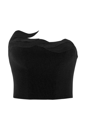 Corselet assimétrico de crepe, com elementos tridimensionais em ondas irregulares cortadas no laser, uma peça única e moderna.
