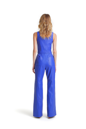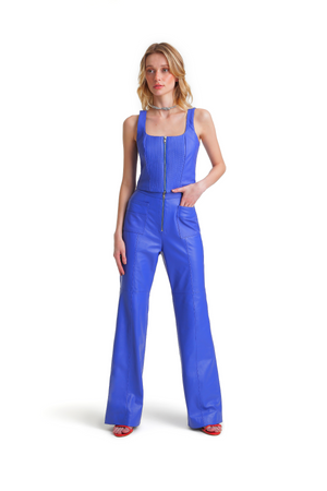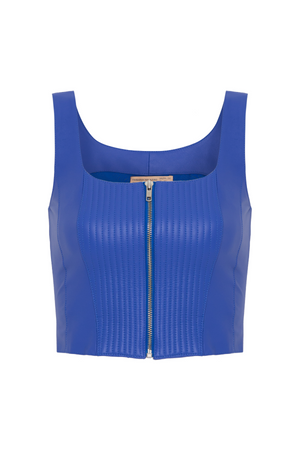 Corselet regata no couro natural, detalhes com nervuras verticais, decote quadrado e fechamento por zíper frontal.