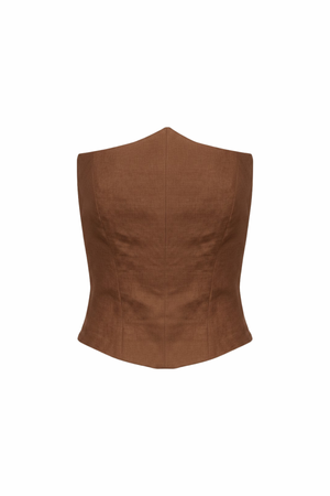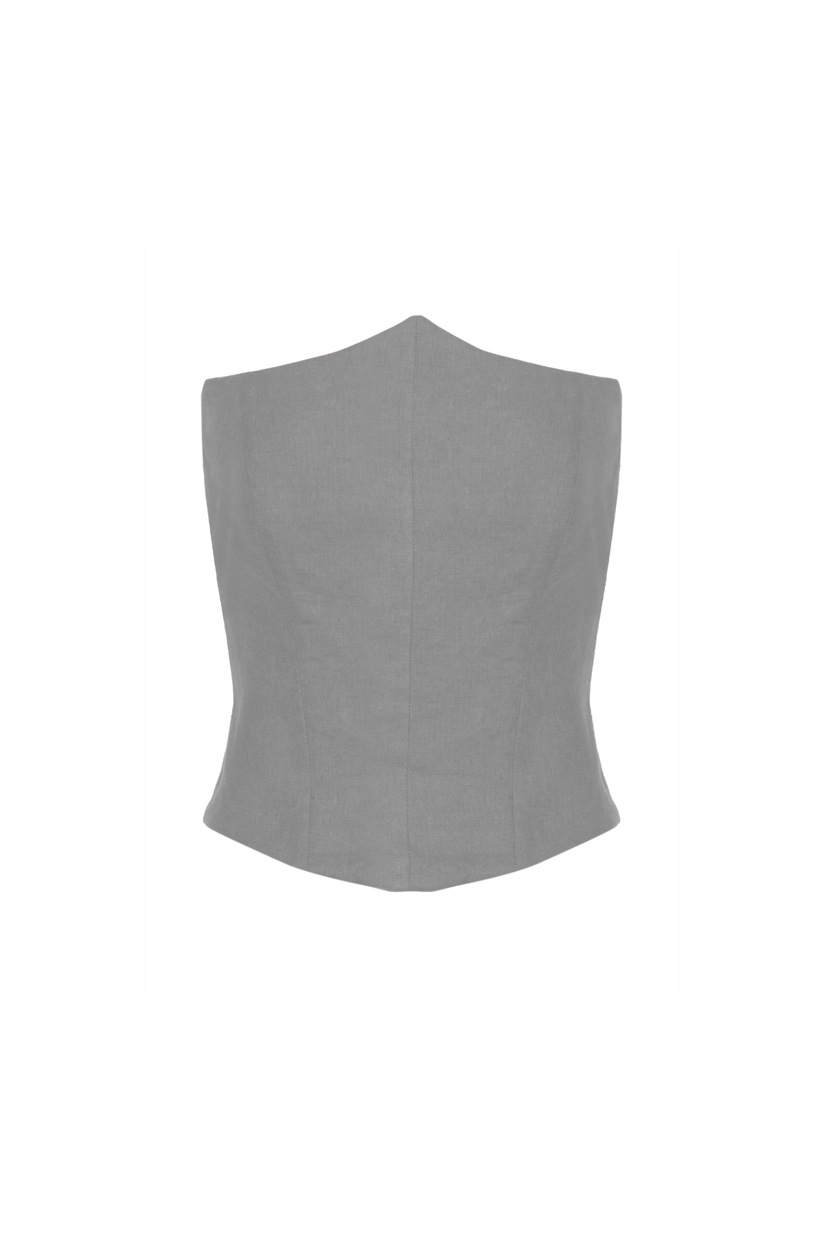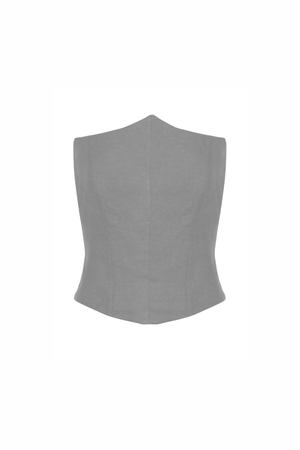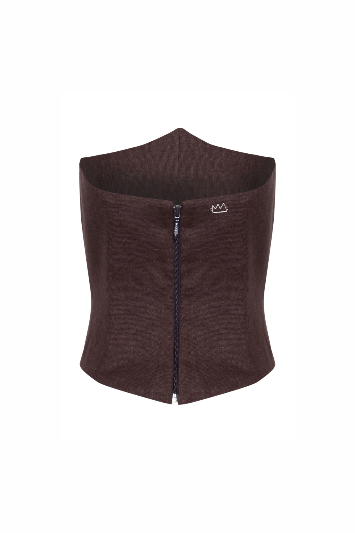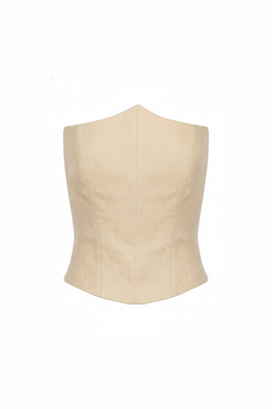 Corset 100% linho com decote reto assimétrico levemente curvado, com modelagem estruturada. Possui fechamento em zíper nas costas.