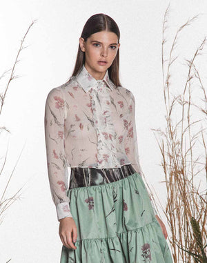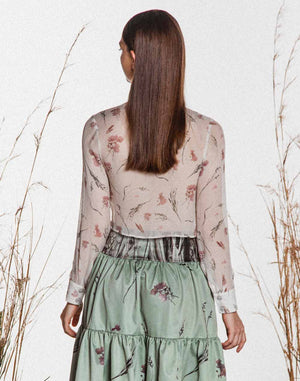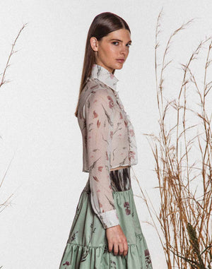 Cropped de seda em estampa exclusiva, mangas longas, com detalhes de babados.