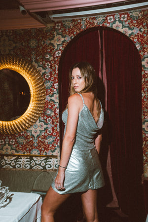 Top de malha metalizada, com decote blusado e alças de corrente.