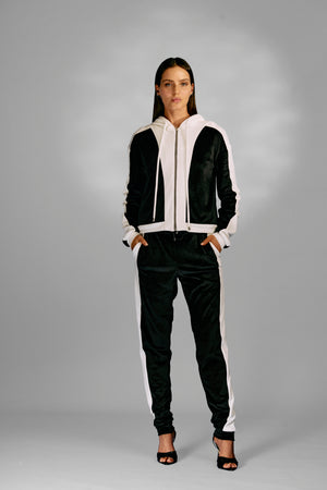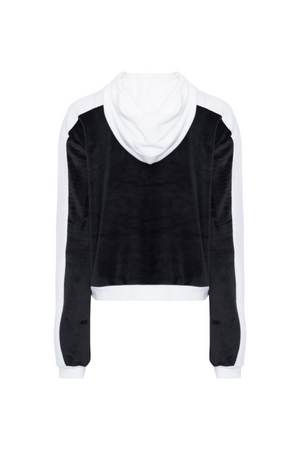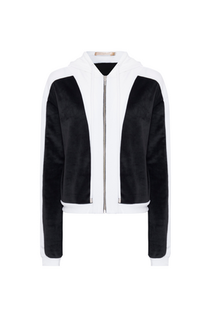 Jaqueta bicolor de veludo, com punhos, laterais e capuz brancos, contrastando com o corpo preto. Uma peça que equilibra tendências atuais e um design atemporal, perfeita para qualquer ocasião.