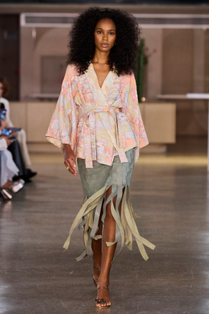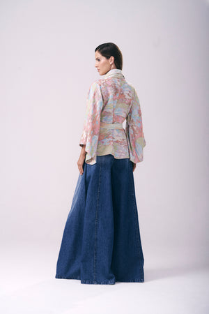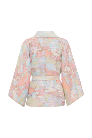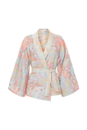 Kimono em jacquard com estampa multicolorida que une elegância e modernidade. Sua modelagem ampla e mangas largas garantem conforto, enquanto a faixa do mesmo tecido permite ajustar a peça, valorizando a silhueta com sofisticação. O tecido estruturado confere um caimento firme, destacando a qualidade e o design refinado desta peça única. Ideal para quem busca estilo e presença em qualquer ocasião.