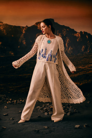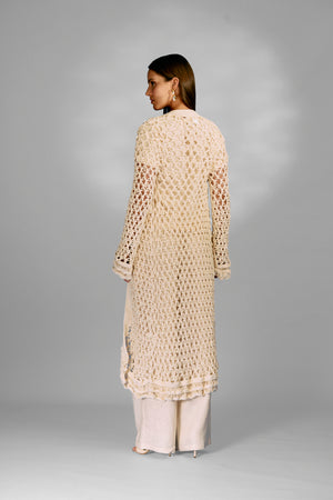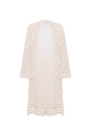 Kimono em crochê artesanal, que traz um toque boho ao visual. Com um padrão de pontos abertos, essa peça é versátil. Suas mangas amplas e o comprimento alongado criam uma silhueta fluida, ideal para dias de meia-estação.
