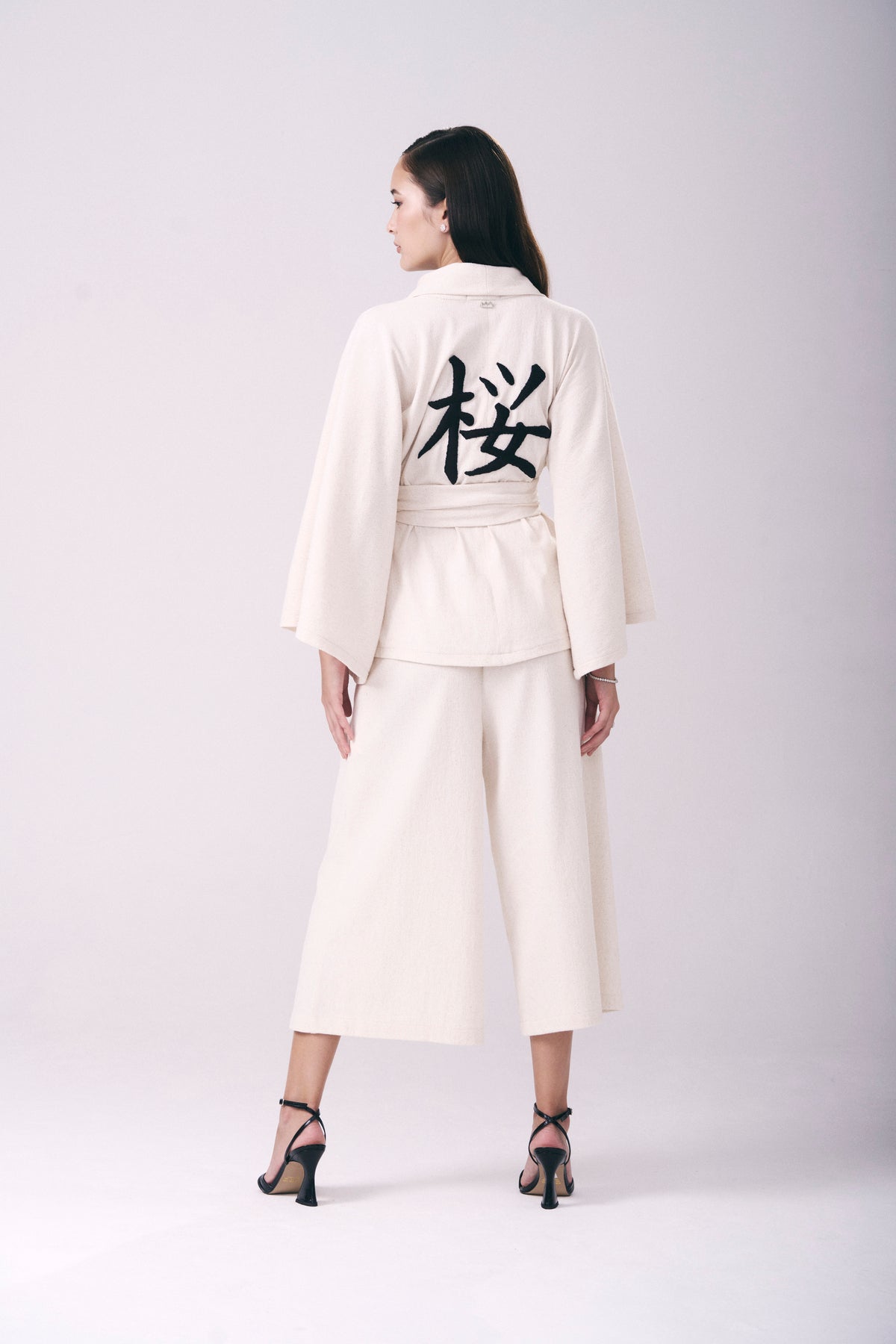 Kimono sofisticado combina a suavidade do moletom com a textura natural do linho, oferecendo uma modelagem ampla e mangas largas para um caimento elegante e confortável. A faixa do mesmo tecido permite ajustar a peça na cintura, realçando a silhueta com sutileza. O acabamento reto na barra reforça a estética clean, enquanto o bordado nas costas com o ideograma japonês “Sakura” agrega um toque artístico e exclusivo, perfeito para quem valoriza design e cultura em uma peça versátil.