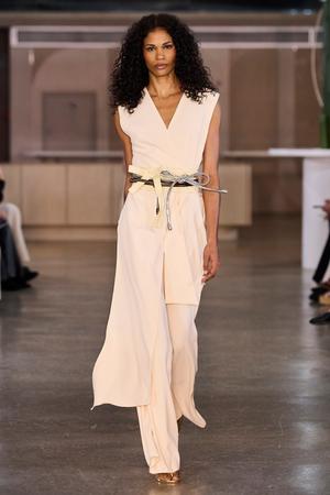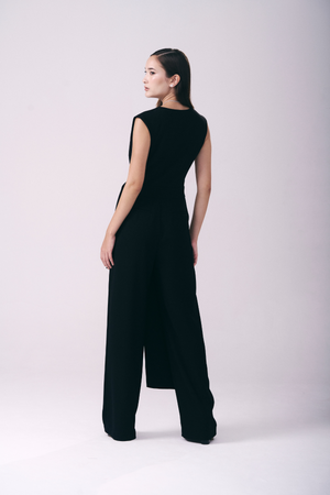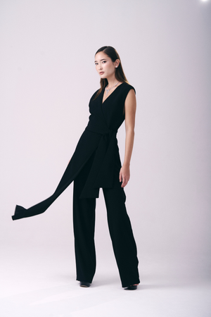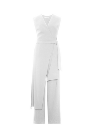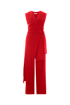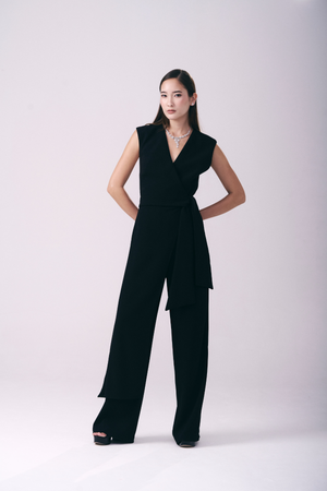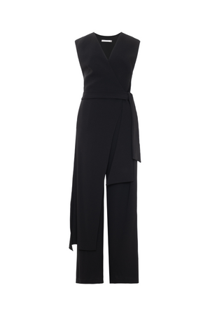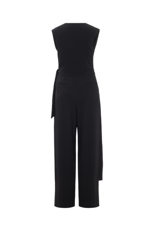 Este macacão em crepe Victória combina elegância e conforto com sua modelagem sem mangas e decote transpassado em V. A faixa longa fixa na cintura valoriza a silhueta, enquanto a calça de caimento reto e alongado confere um toque sofisticado e moderno ao visual. Ideal para ocasiões que pedem estilo refinado e praticidade.